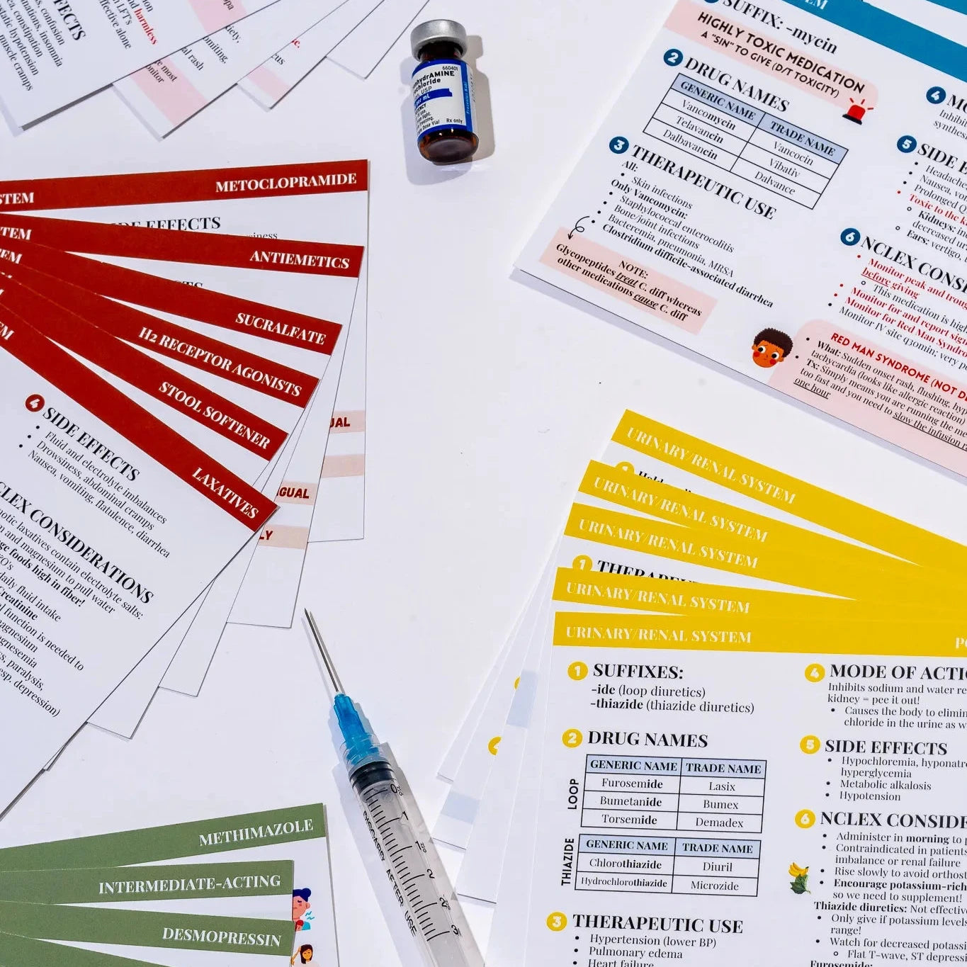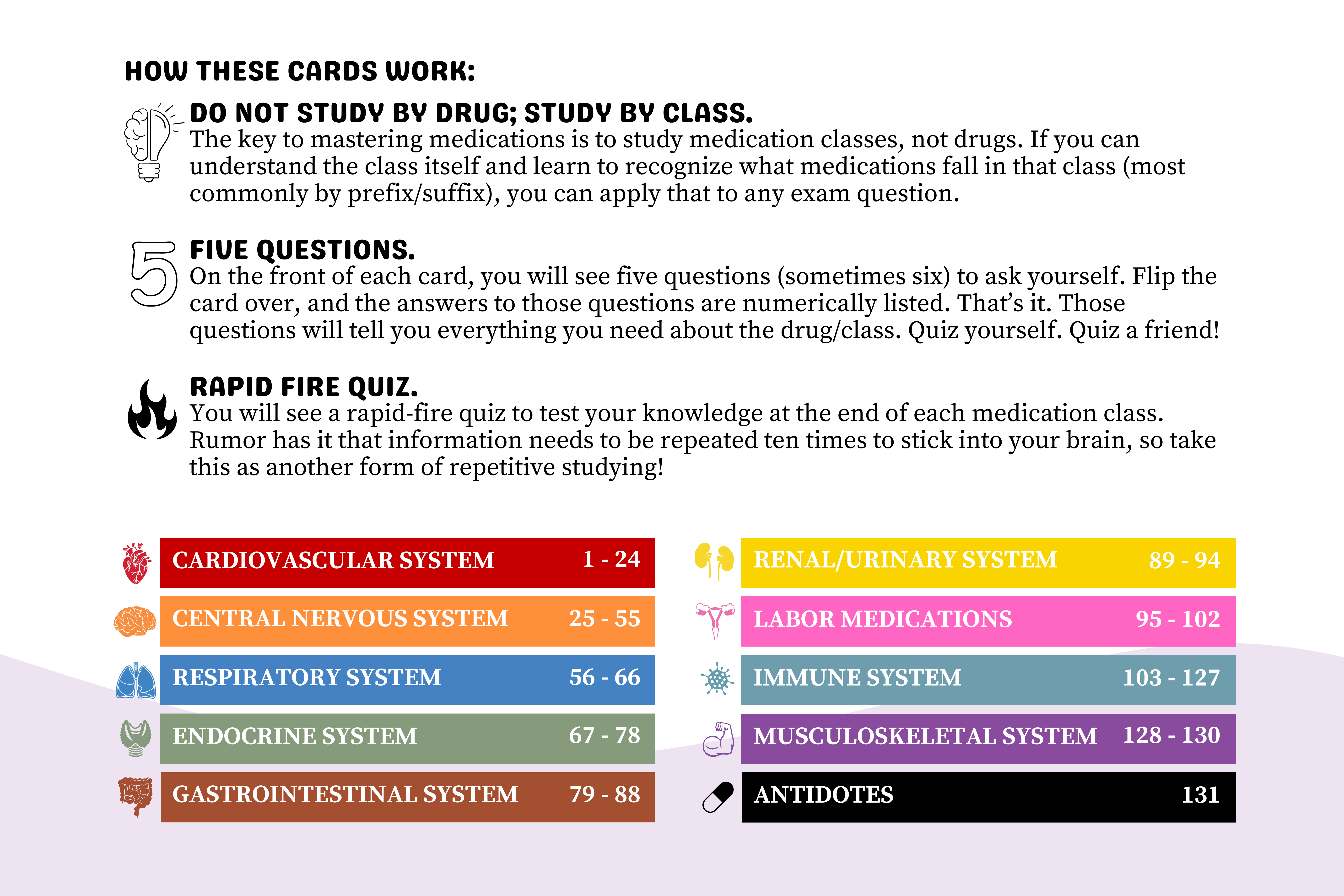 - Includes 13 "Section Summary” cards to test your knowledge at the end of each medication class! This is the most important information to know for each class!