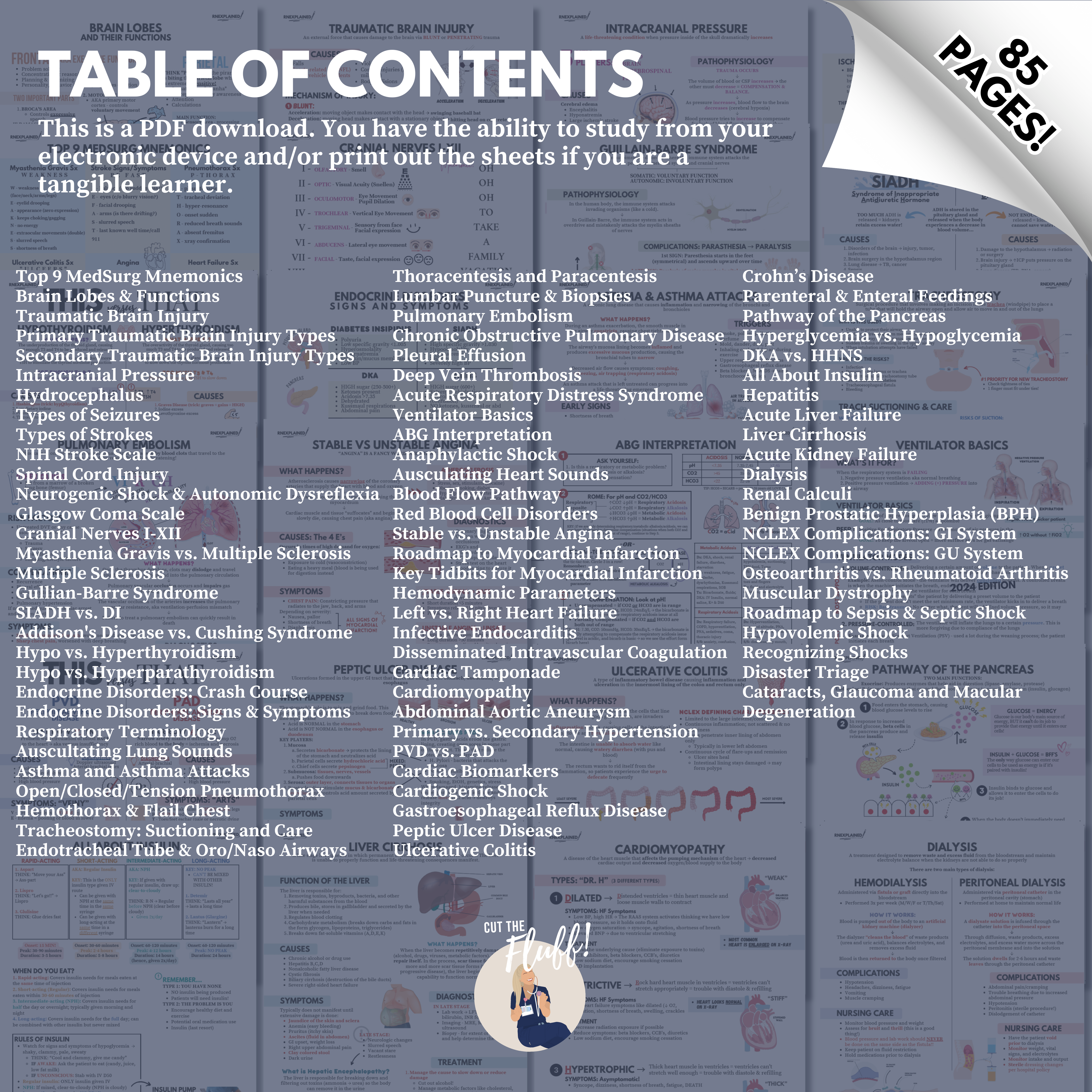 What’s inside? This digital bundle includes 85+ nursing topics tailored to Med-Surg, Advanced Med-Surg and Critical Care. Please refer to the listing photos for a detailed table of contents.
